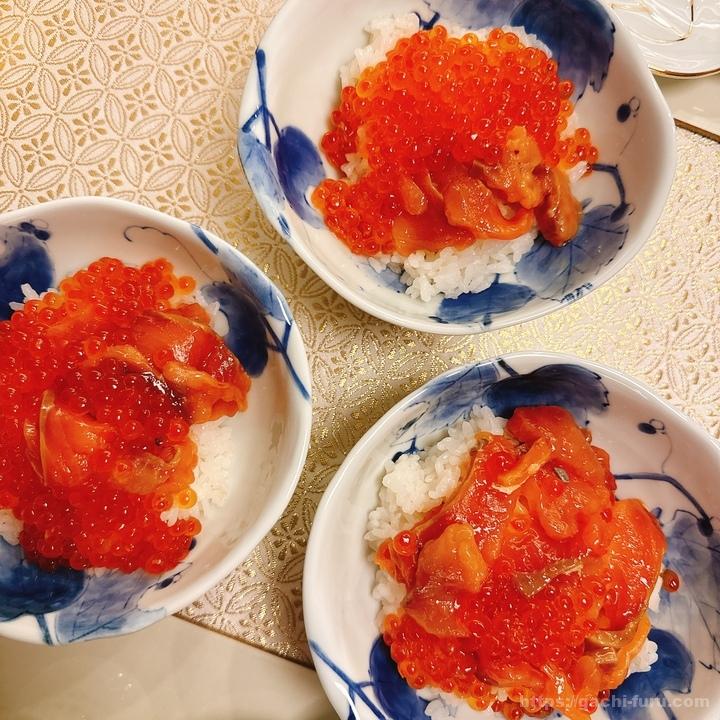 それぞれ好みがあり、おじさんはサーモンの方が好き、奥さんは同じぐらい、こどもはいくらのほうが好き、ということで配分がちょっとずつ違う。