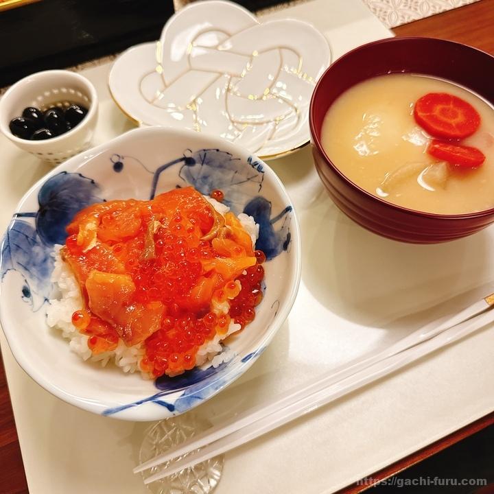 年始のある日の食卓。いくら醤油漬けと、づけサーモンの計2パックを解凍。