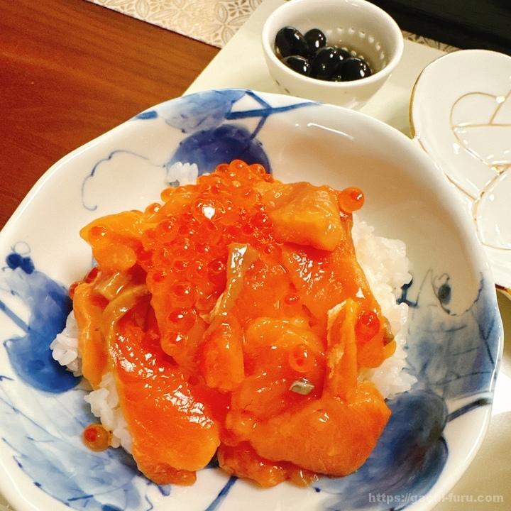 開封してみるとこんな感じ。づけサーモンのほうにもいくらがちらほら入っている。