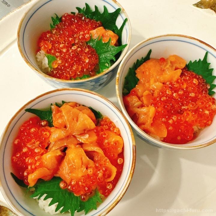 家族3人でいくらサーモン丼を作成。右下のおじさんは、づけサーモンメイン。奥さんと子供はいくらメインとなった。