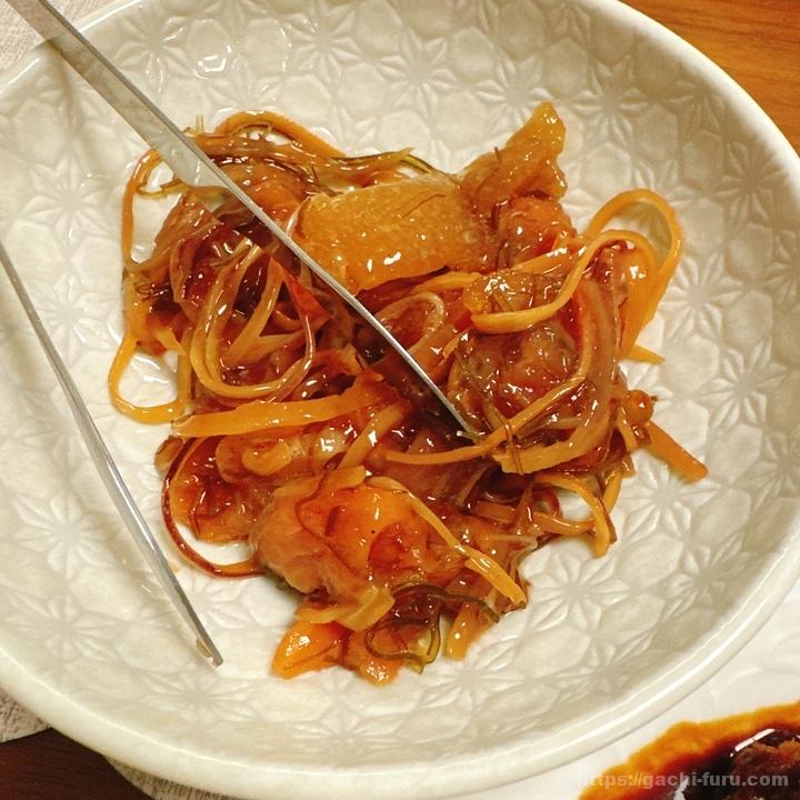 松前漬けはこのように、サーモンをメインとしつつもイカの細切りや数の子も入っている、これぞまさに酒の肴&お正月のメニュー、という感じであった。