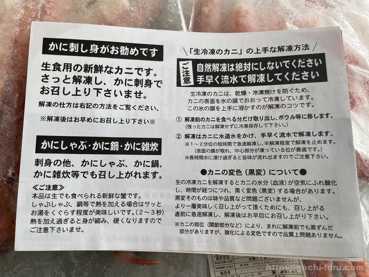 おじさんの家はよく「かに道楽」に行くので舌が肥えているというのはあるのかもしれないし、冷凍のカニの刺身を頼んだのは初めてなので、冷凍とはこういうものなのかもしれない。しかし、いずれにせよ満足はできなかった。各レビュー等も見てみたが、皆さん、刺身ではなくしゃぶしゃぶ等で食べられているようだ。