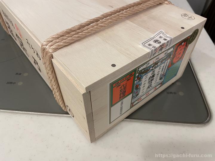 いつもの木箱に入っての到着。絵柄は毎年変わっているのだろうか。