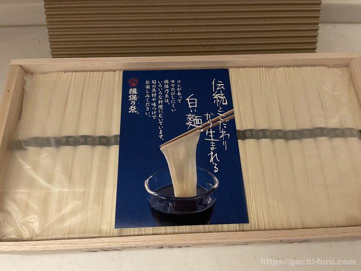 兵庫県宍粟市から「播州手延べそうめん揖保乃糸 特級品2.7kg」が届いた。