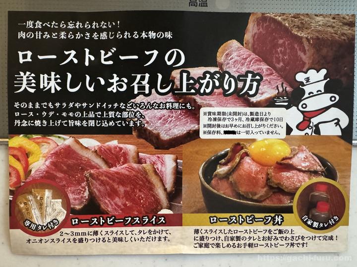 パンフレットも同封。「美味しいお召し上がり方」と書いてあったが、「スライス」「ローストビーフ丼」という、誰でも知っているであろう食べ方のみ掲載されてあった。