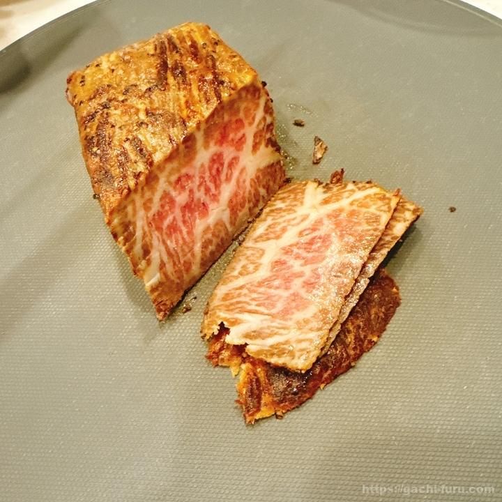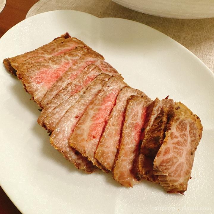 さて、まな板にてしっかりと切る。かなりサシが入っているのが分かる。これがA5の所以であろう。
