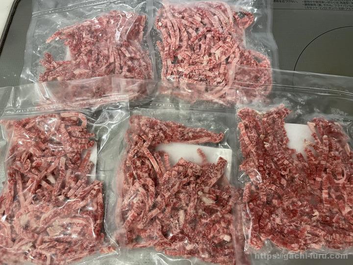 開けてみると、牛ユッケが5袋。1袋は80gである。
