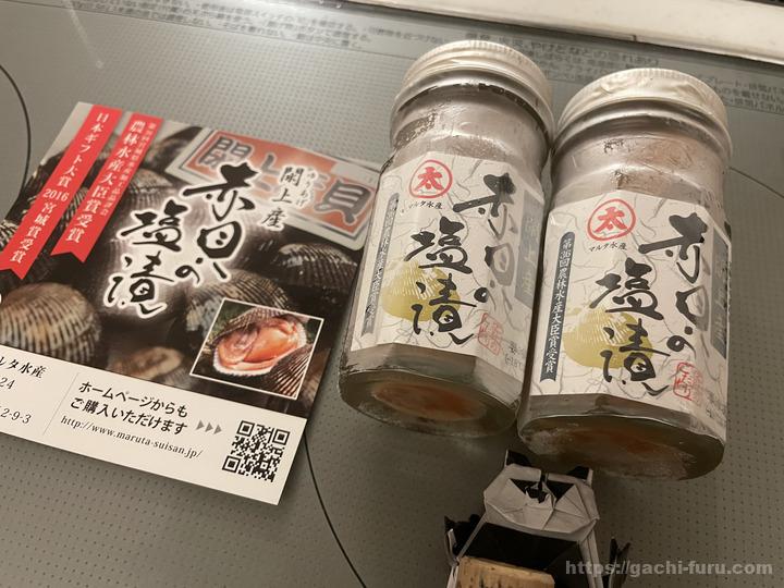 開封してみた。冷凍した赤貝が2瓶と、パンフレットである。