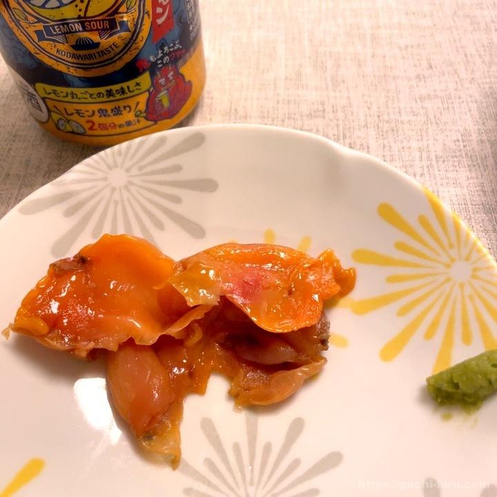 食してみた。ちょっとわさびをつけている。添えている酒は「檸檬堂」の檸檬サワーである。