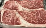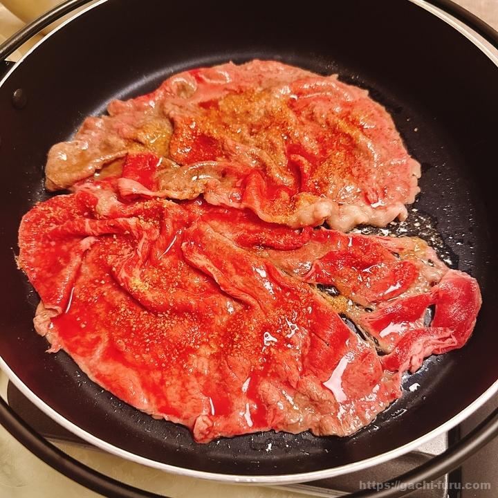 すき焼き鍋に広げたところ。肉1枚が大変大きく、鍋に敷けるのは2枚が限界。関西風に肉を焼きながら砂糖・醤油・味醂で味付けしていただく。