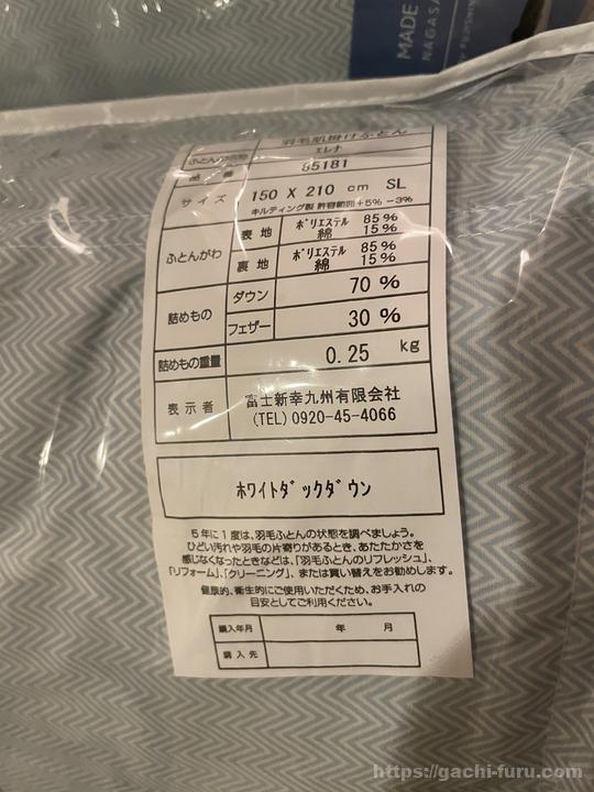 タグはこのようになっている。ダウン70%、フェザー30%という配合。