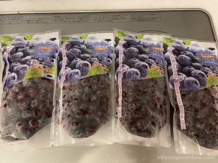 冷凍ブルーベリーがぎっしり詰まった袋が4袋。