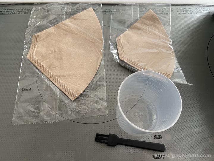 付属品として、3杯用のフィルタ・6杯用のフィルタ・清掃用具・その他取説などが付属していた。