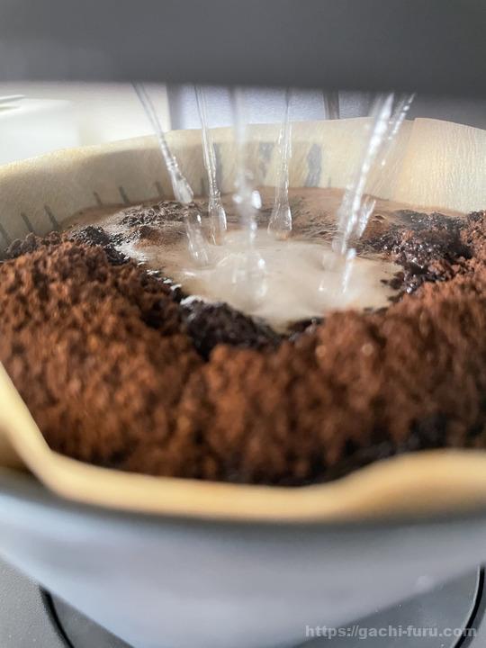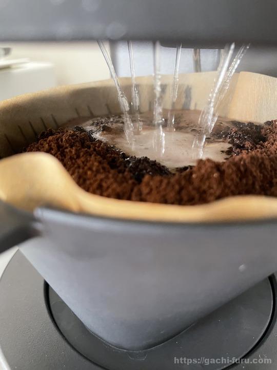 豆を挽き終わると。ドリップ開始。いろいろな角度からお湯が出ている様子が見える。