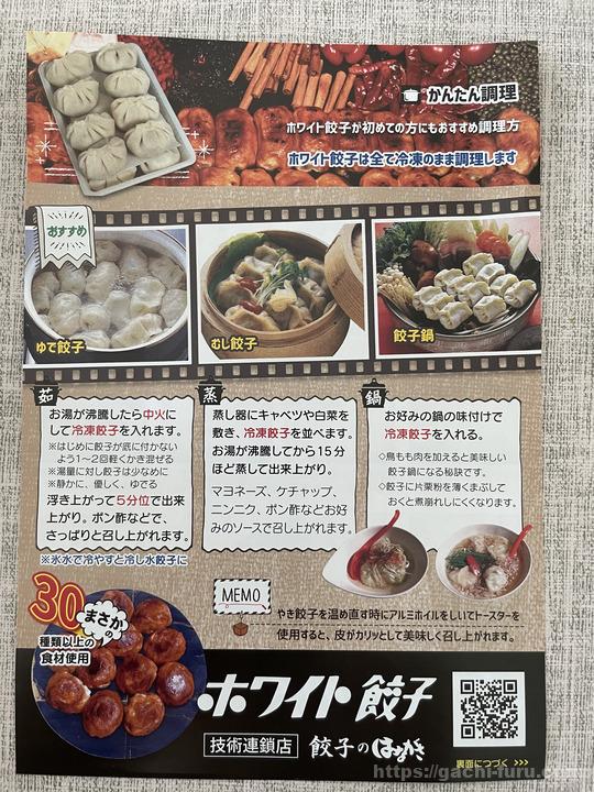 見た目がパンフレットとだいぶ違うのだが、餃子そのものは美味しかった。ただ、かなりボリューミーなので半分ぐらいは残ってしまい、翌日に温め直して食べた。一度に調理する量には注意されたし。