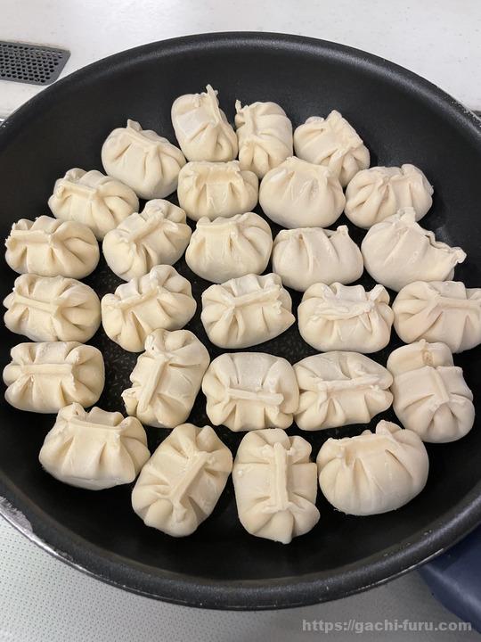 フライパンに並べる。隙間があったら油が跳ねると書いてあったので、できる限りギュウギュウにした。