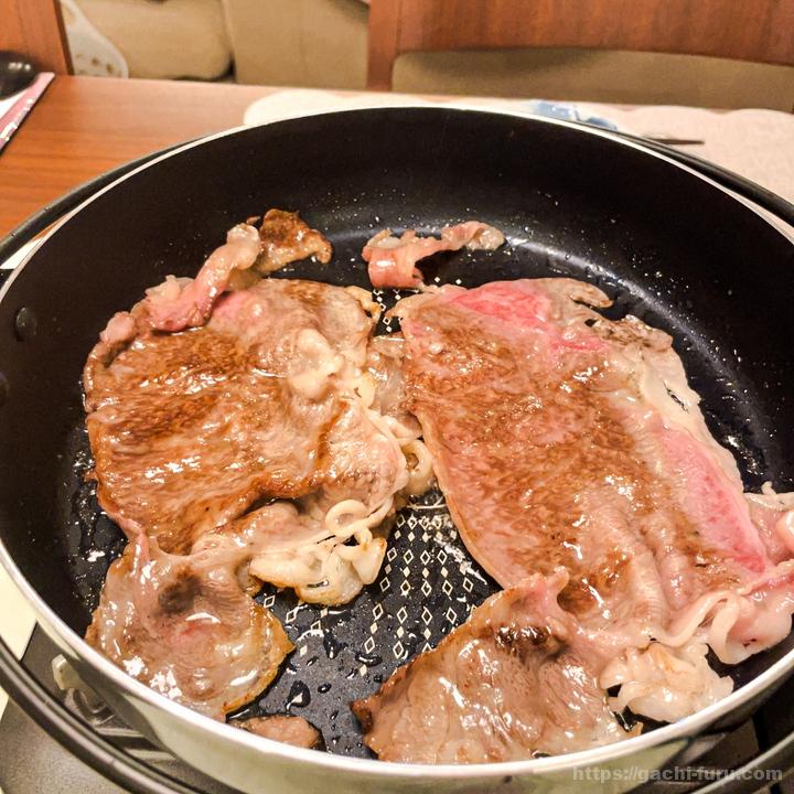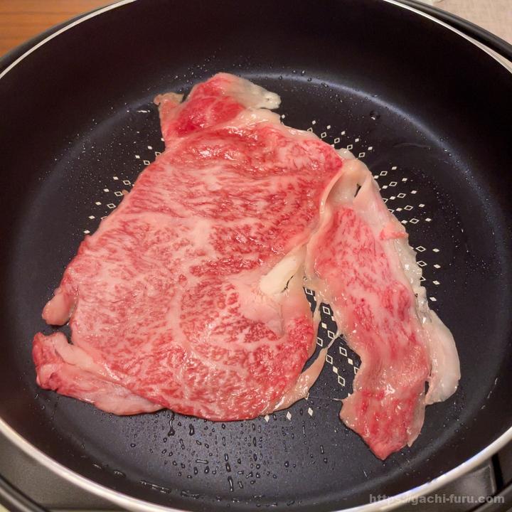 2枚並べて焼く。言い忘れたが、おじさんは関西に住んでいるので、すき焼きも関西風である。いわゆる「割り下」を使わずに焼いて砂糖と醤油とみりんをその場でかけていくスタイル。