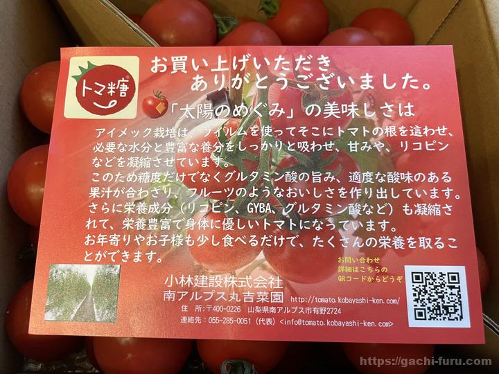山梨県南アルプス市から「おいしい~甘~いフルーツトマト「トマ糖-太陽のめぐみ」1kg」が届いた。寄付額は11,000円であった。